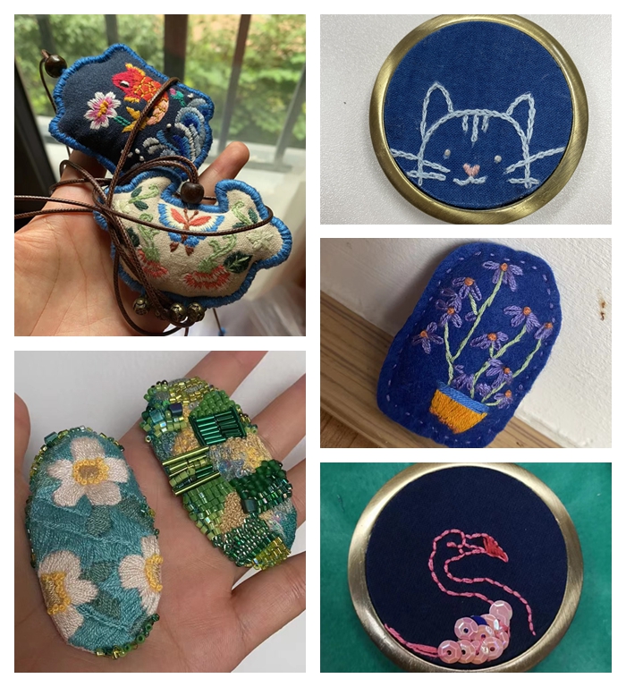 活动中,参加活动的“大朋友”和“小朋友”们会在刺绣老师的指导下挑选心仪的花样,搭配所选花样的布料和相应的绣线,现场进行制作。设计,绣花,裁剪,缝针,粘黏······每一个步骤都自己完成,各创其思。零散的物件逐渐合而为一,变成一件件精巧,细致,独具一格的作品。